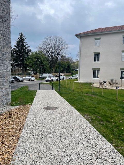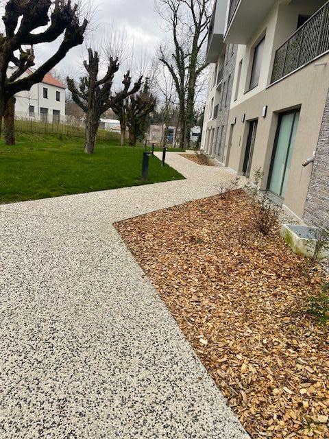 Création d'espace verdoyant avec gazon, revêtement béton désactivé, escalier, massifs fleuris avec paillage, arbustes plantés et installation de boîtes aux lettres et de poubelles.