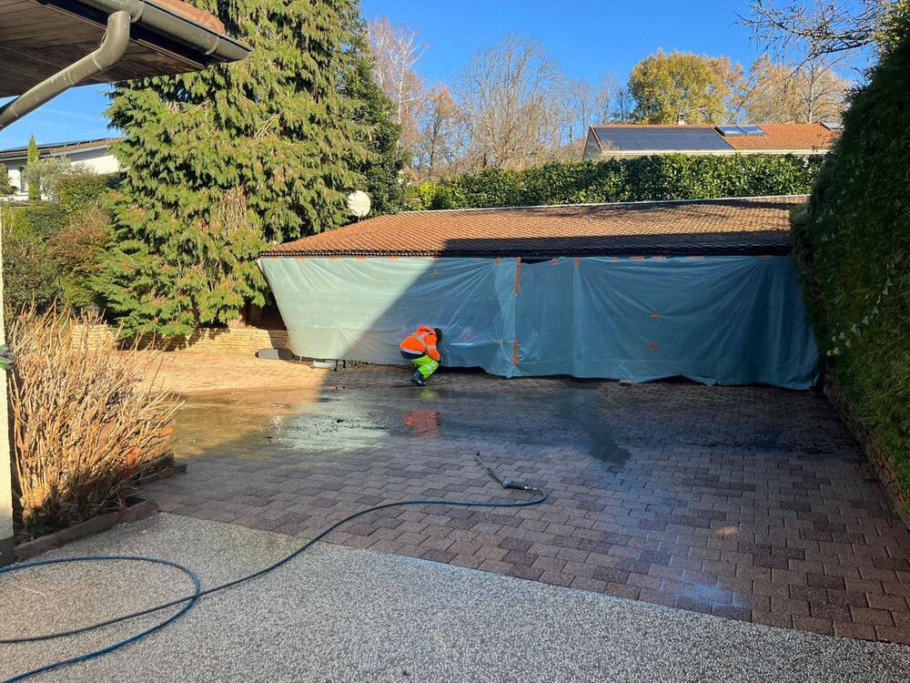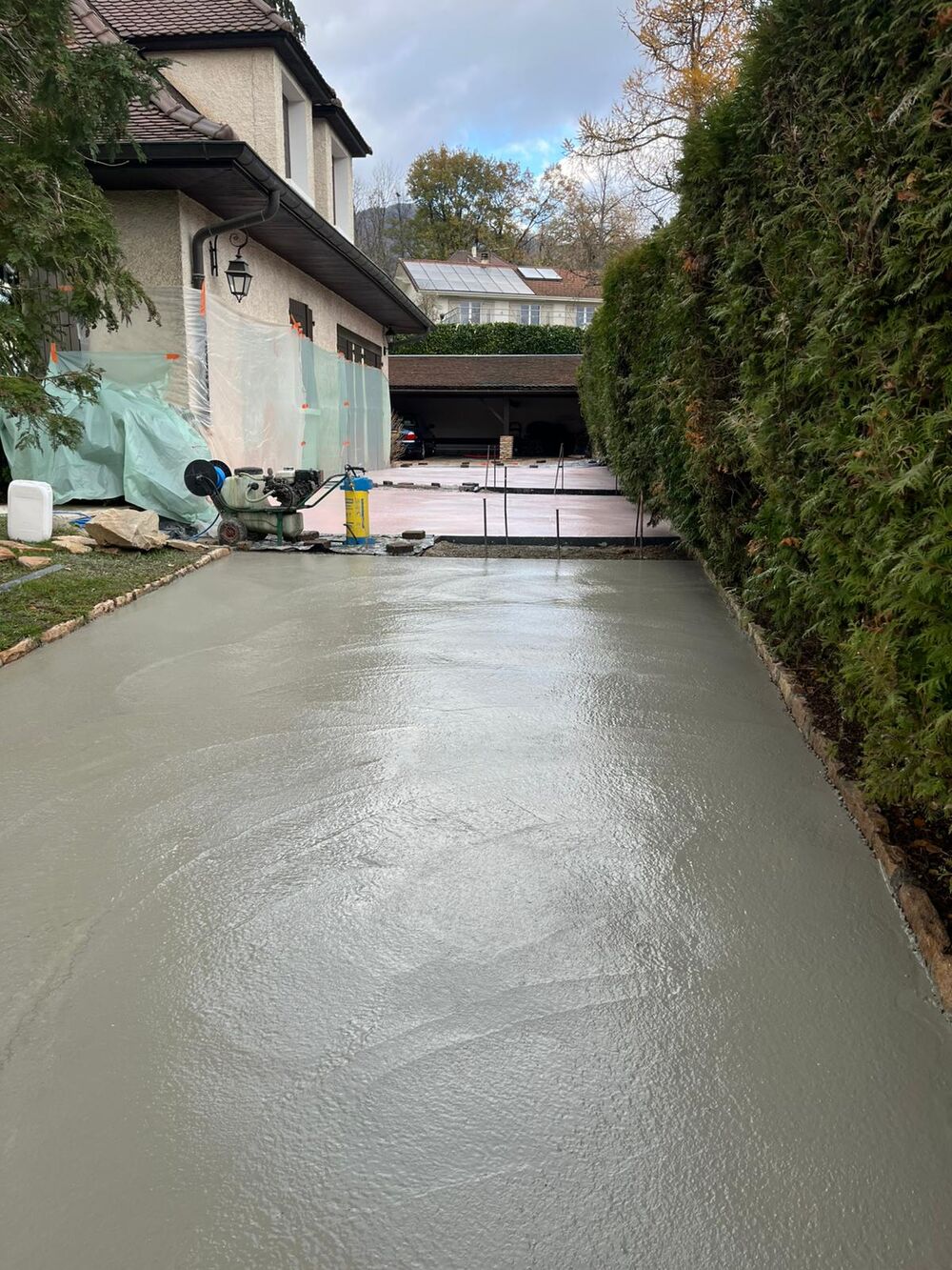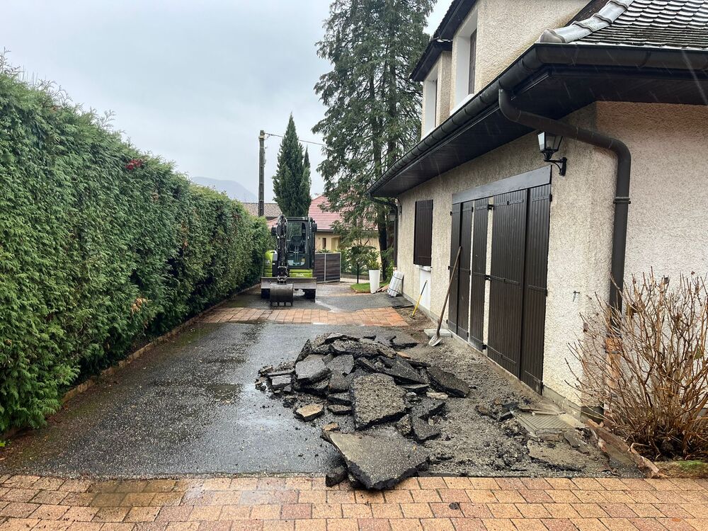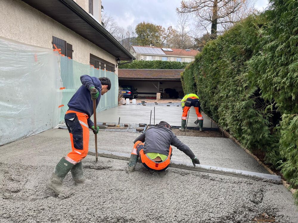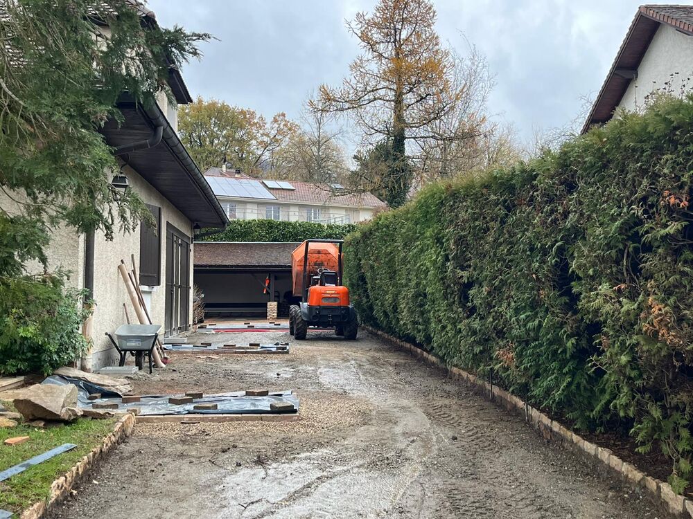 Réaménagement des accès d'un client pour les rendre plus fonctionnels : terrassement, suppression de l’enrobé et dépose des pavés, préparation du fond de forme et repose des pavés, installation des pavés sur gravette, ferraillage de la zone destinée au béton désactivé, coulage du béton désactivé, application du désactivant, nettoyage des surfaces pavées et réfection complète des joints.